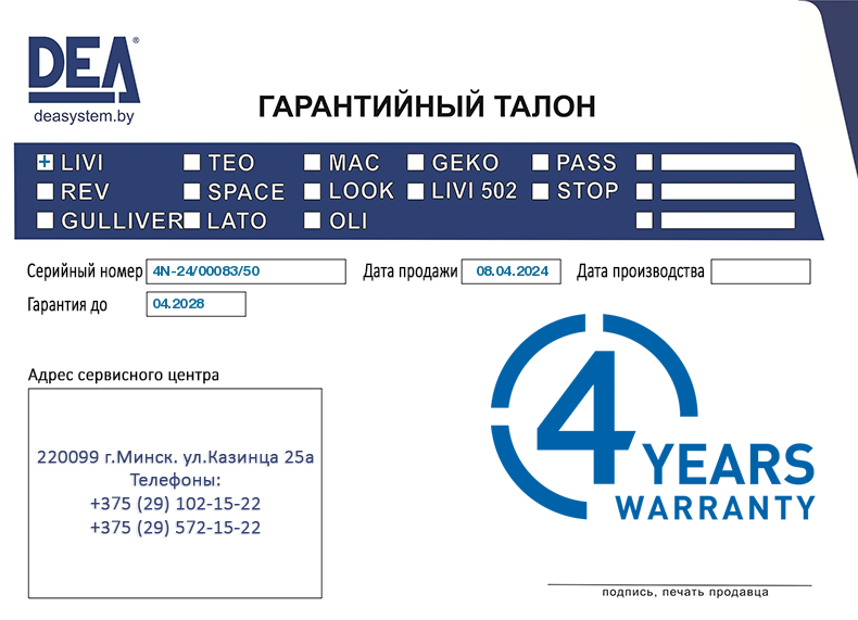 К каждому проданному электроприводу ворот мы прилагаем гарантийный талон, который должен быть заполнен в момент продажи или монтажа. С этого времени мы гарантируем исправную работу привода в течение 3-х лет (при соблюдении правил монтажа и эксплуатации). Если за этот период что-то случится с вашим электроприводом - затраты на запасные части и выполнение ремонта будем нести мы. Мы даём один из самых больших гарантийных сроков, поскольку безоговорочно уверены в качестве нашего продукта. Узнайте, как получить Расширенную гарантию на данный привод. Мы имеем собственный склад запчастей для всей линейки предлагаемых приводов. Это позволяет выполнять ремонт, если таковой понадобится, в самые короткие сроки.