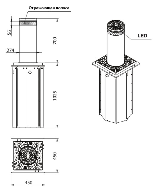 Движение цилиндра обеспечивается гидравлическим узлом, расположенным внутри него. Гидравлический столб, препятствующий движению транспортных средств, оснащен предохранительным устройством ручного расцепления, которое позволяет опускать цилиндр, освобождая проезд в случае чрезвычайной ситуации и/или отсутствия напряжения в сети. Автоматическое опускание гидравлического узла может осуществляться только при дополнительно установленном электроклапане. В этом случае можно выбрать режим расцепления, оказывая воздействие непосредственно на электроклапан, активируя или нет автоматическое опускание цилиндра в случае отсутствия напряжения.