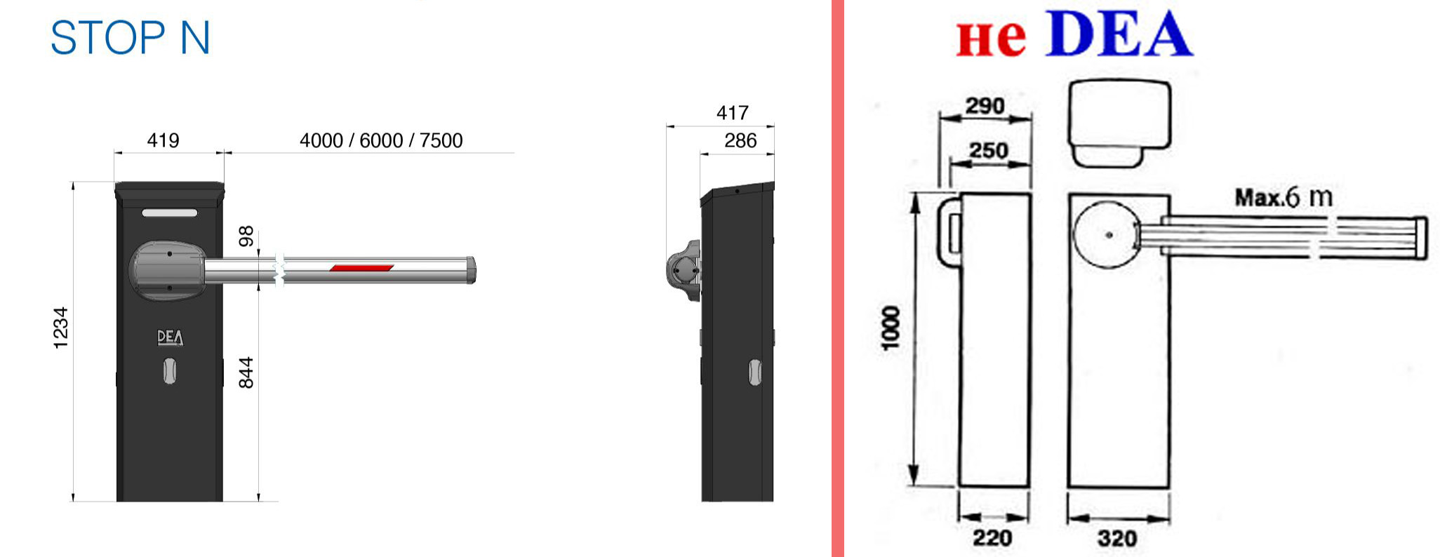 Электромеханический шлагбаум STOP/24 N оснащен самым современным блоком управления NET24N/C, снабжён датчиком, защищающим от раздавливания (энкодер), а также приёмником радиокоманд, работающем на частоте 433 МГц. Есть возможность регулировки скорости рабочего хода, настройки замедления хода при открывании и закрывании, а также, корректировки более 90! рабочих параметров, для идеальной работы шлагбаума на любом объекте, с обеспечением максимальной безопасности. Длина стрелы данной модели – 4 метра. Интенсивность работы шлагбаума STOP/24 N - очень высокая, за счёт применения мощного электродвигателя с рабочим напряжением 24 B, она составляет 500 (!!!) циклов в час. Это означает, что данный механизм можно полностью открывать и закрывать каждые 7 секунд без дополнительных перерывов, что не даст транспорту скапливаться у проезда. Говоря коротко, шлагбаум STOP/24 N, производства DEA System - это настоящий исполин в мире устройств ограничения проезда, состоящий из чистого металла и мощи! На картинке ниже, вы можете видеть в масштабе соотношение размеров шлагбаумов серии STOP N и другого широко распространённого шлагбаума. Сразу бросается в глаза тот, где пытались сэкономить на всём.